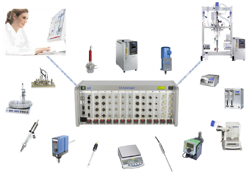 将现有实验设备(如温度计、pH计、过程光谱仪、进料泵、搅拌器、天平等)与LabManager®系统连接起来,可实现对反应过程中的温度、压力、化学成分实时含量、搅拌速度、进料、天平称量、自动取样等各项参数及过程的自动化控制,亦可根据客户的具体工艺编写运行程式。